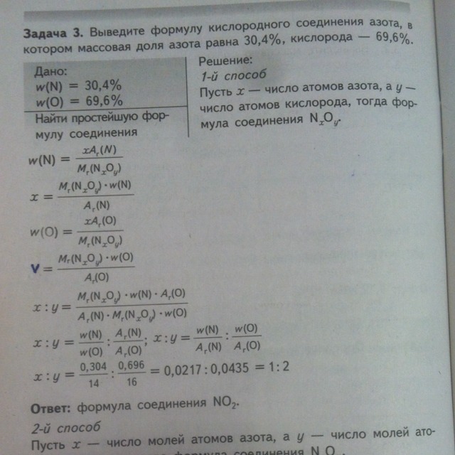 х относиться к у, так как, отношение массовой доли Нитрогена к его атомной массе, относится к отношению массовой доли Оксигена к его атомной массе. Далее в решении находят конкретные цифры отношений массовых долей к атомным массам данных элементов, и получают х : у = 0,0217 : 0,0435.