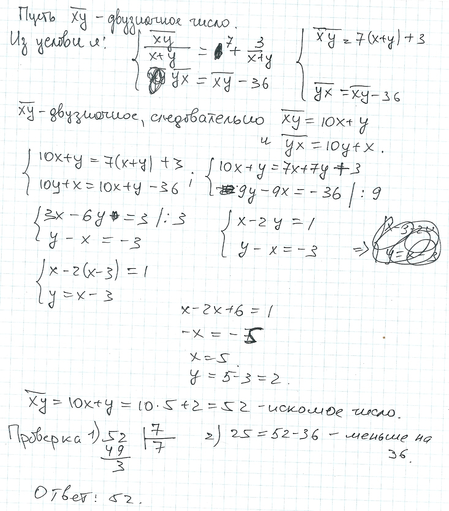При делении двузначного числа на сумму его цифр в частном получается 7 , а в остатке 3.Найдите это число,если известно,что при перестановке его цифр получается число,меньше искомого на 36.