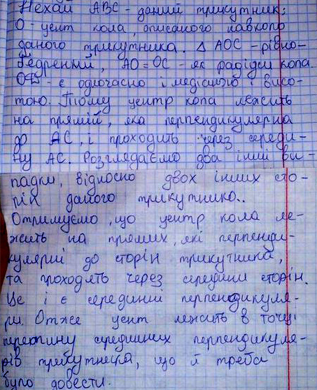 Коло називають описаним навколо трикутника, якщо воно проходить через усі вершини трикутника.При цьому трикутник називають вписаним у коло.На малюнку 220 коло описано навколо ∆АВС.Центром кола, описаного навколо трикутника, є точка перетину серединних перпендикулярів до його сторін.На малюнку 220 центр описаного навколо трикутника АВС кола - точка О є точкою перетину серединних перпендикулярів до сторін трикутника АВ, АС і ВС.Легко зрозуміти, що серединні перпендикуляри до сторін трикутника перетинаються в одній точці. Загальні формули для знаходження радіуса описаного кола будуть розглянуті у наступних параграфах. В цьому параграфі дамо формулу для обчислення радіуса кола описати навколо прямокутного трикутника:Центром кола, описаного навколо прямокутного трикутника, є середина гіпотенузи, а радіус кола дорівнює половині гіпотенузи.