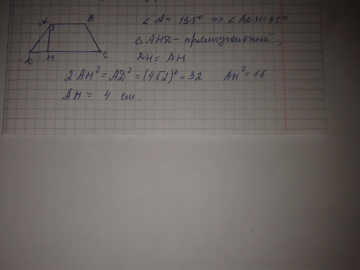 Сумма двух смежных углов =180, сл-но угол Д=45 град. sin45=h/4√2 Отсюда h=4