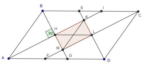 2) биссектрисы параллелограмма ABCD, пересекаясь, образуют прямоугольник HKLM, потому что биссектрисы смежных углов пересекаются под прямым углом:;