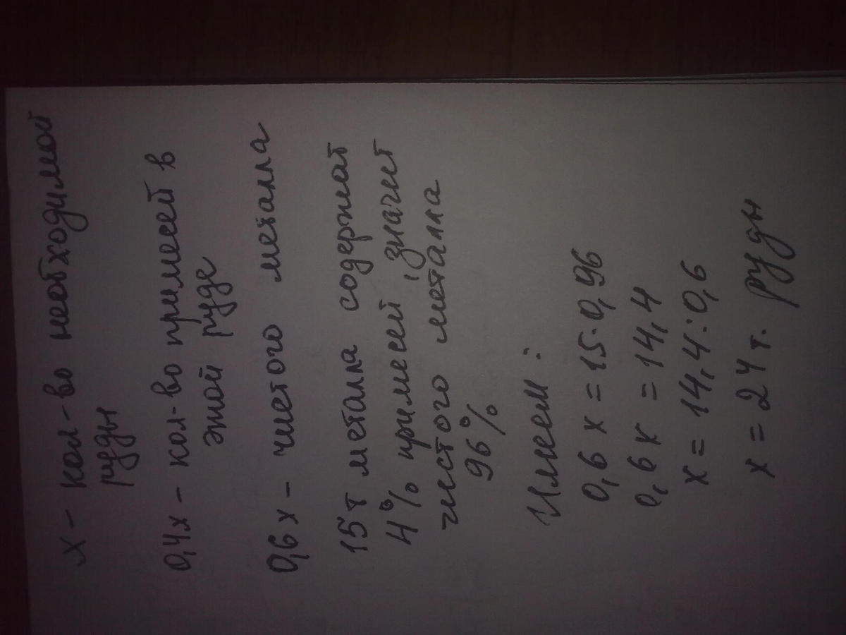 Руда содержит 40% примесей, а выплавленный из нее металл содержит 4% примесей.Сколько тонн руды необходимо взять, чтобы выплавить из нее 15 тонн металла?