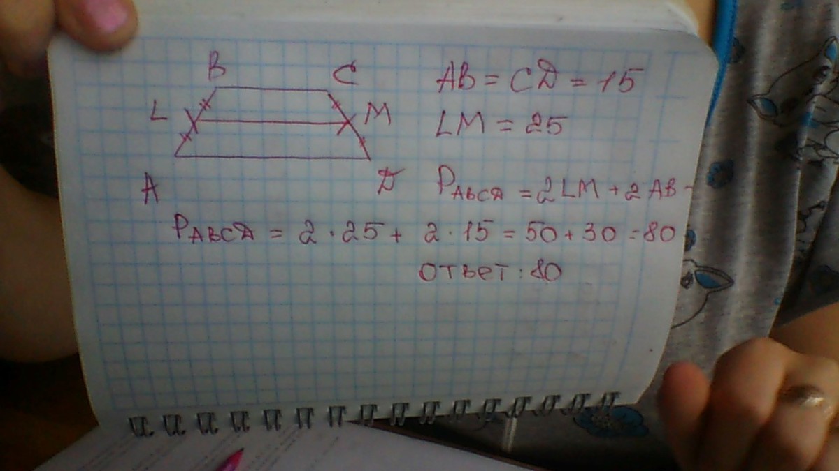 Определите периметр равнобедренной трапеции ,если ее средняя линия равна 25 см,а боковая сторона равна 15 см?