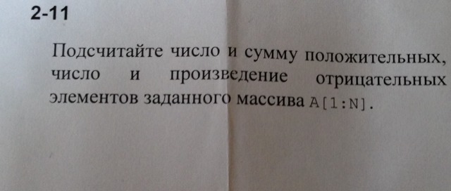 for(i=0;i<n;i++){if(a[i]<0)proizv*=a[i];if(a[i]>0)summ+=a[i]; }