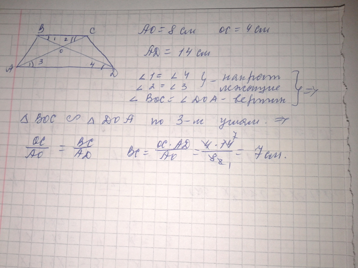 Точка О, которая является пересечением диагоналей трапеции ABCD(AD||BC), делит диагональ АС на отрезки АО = 8см и ОС = 4см.Знайты основу ВС, если АD = 14