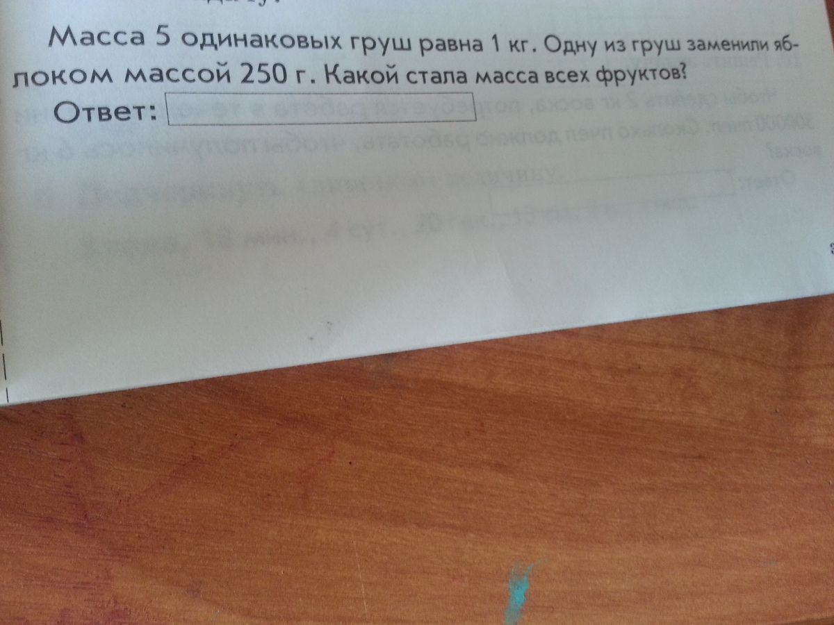 масса одной груши 1000 грамм : 5 = 200 грамм, 4 груши весят 4*200=800 грамм + 250 грамм (яблоко) = 1050 грамм или 1 килограмм и 50 грамм