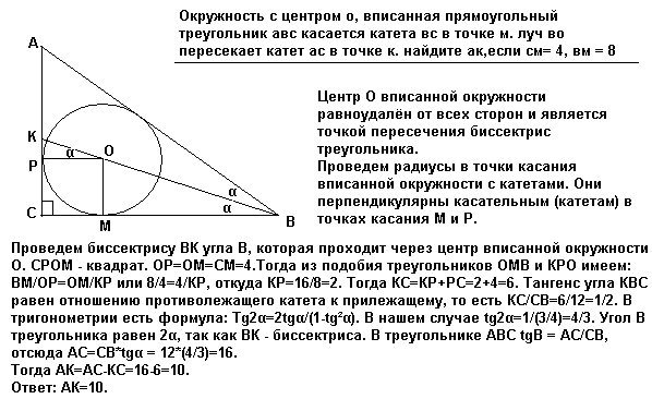 окружность с центром о, вписанная прямоугольный треугольник авс касается катета вс в точке м. луч во пересекает катет ас в точке к. найдите ак,если см= 4, вм = 8