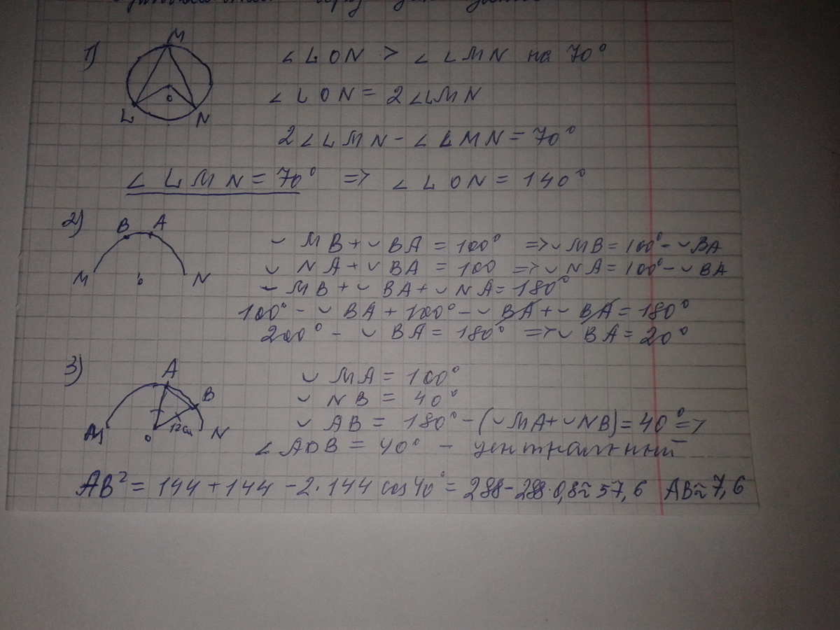 1) Центральный угол LON на 70 градусов больше вписанного угла, опирающегося на дугу LN. Найдите этот вписанный угол.