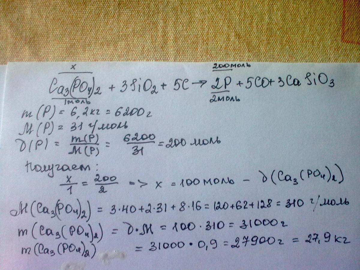 рассчитайте массу фосфата кальция содержащего 10% примесей необходимую для получения 6,2 кг фосфора