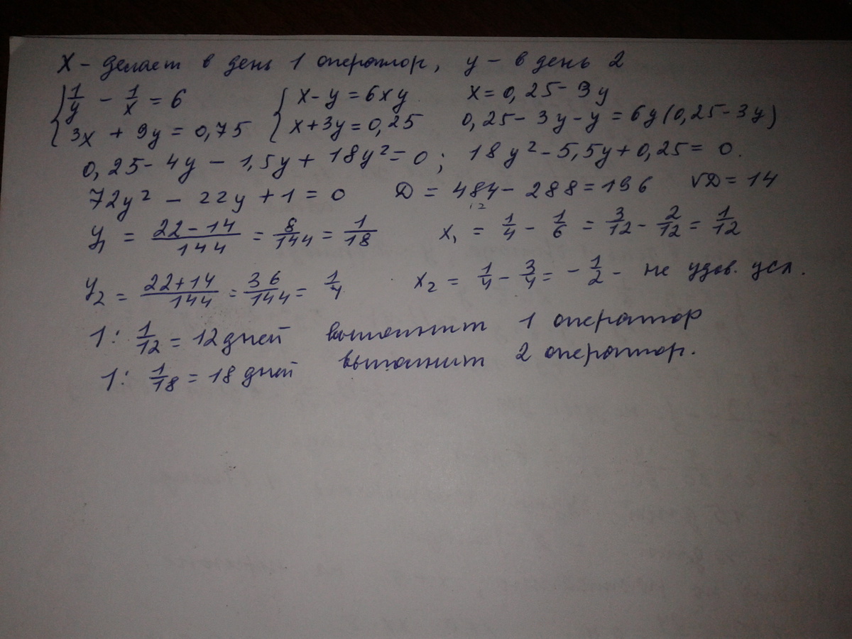 Один оператор може зробити компютерний набір книжки на 6 днів швидше, ніж другий. Якщо перший працює 3 дні, а потім його замінить другий і працює 9 днів, то буде виконано 75% набору. За скільки днів може виконати цей набір кожний оператор, працюючи самостійно?