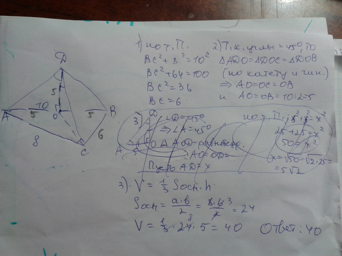 Основанием треугольной пирамиды МАВС ЯВЛЯЕТСЯ ПРЯМОУГОЛЬНЫЙ ТРЕУГОЛЬНИК АВС с гипотенузой АВ=10 И КАТЕТОМ ас = 8. Боковые ребра пирамиды образуют с высокой пирамиды равные углы в 45 градусов. Найдите объем пирамиды.