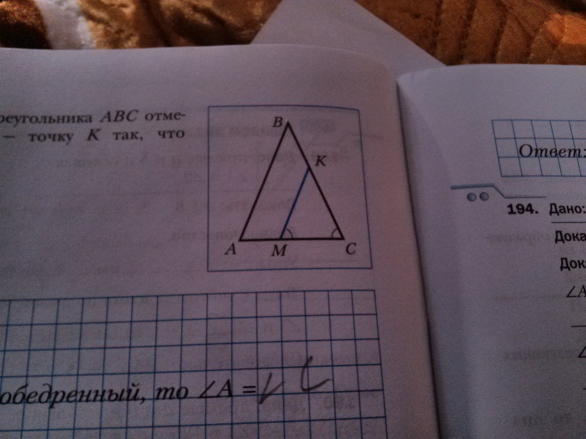 На основании ас равнобедренного треугольника авс отметили точку м а на стороне вс точку к так что угол кмс равен углу с докажите что мк параллельно ав