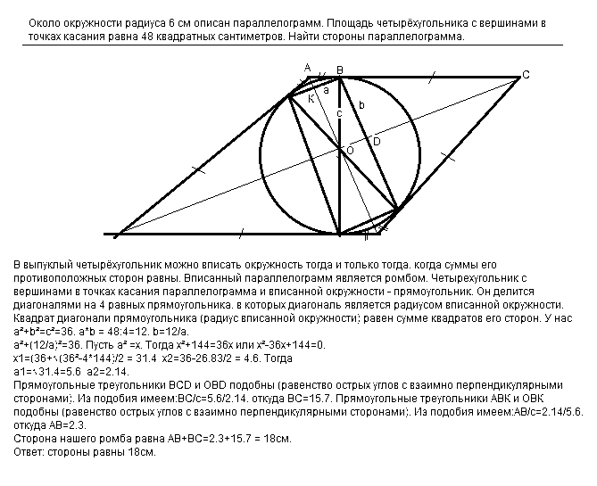 В выпуклый четырёхугольник можно вписать окружность тогда и только тогда, когда суммы его противоположных сторон равны. Вписанный параллелограмм (параллелограмм, в который вписана окружность) является ромбом. Четырехугольник с вершинами в точках касания параллелограмма и вписанной в него окружности - прямоугольник. Он делится диагоналями на 4 равных прямоугольника, в которых диагональ является радиусом вписанной окружности. Квадрат диагонали прямоугольника (радиус вписанной окружности) равен сумме квадратов его сторон. У нас а²+b²=с²=36, а*b = 48:4=12. b=12/a.а²+(12/a)²=36.