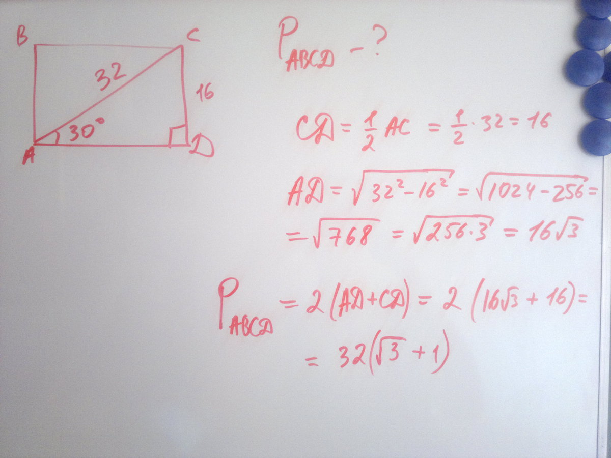 диагональ прямоугольника равна 32 см и образует со стороной угол 30 градусов чему равен периметр прямоугольника