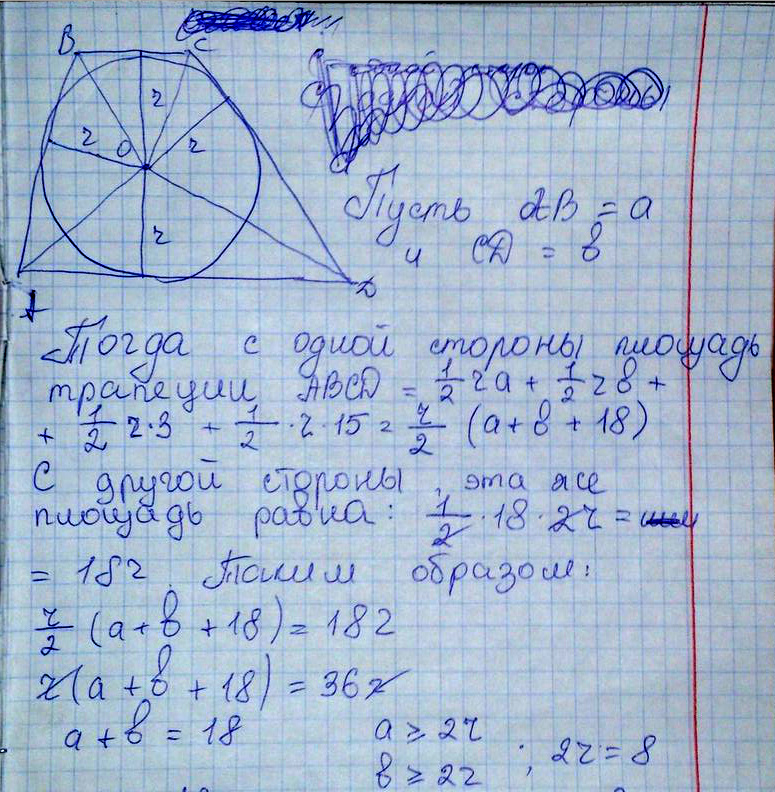 основи трапеції дорівнюють 3 см і 15 см. Чи може радіус кола, вписаного у трапецію, мати довжину 4 см