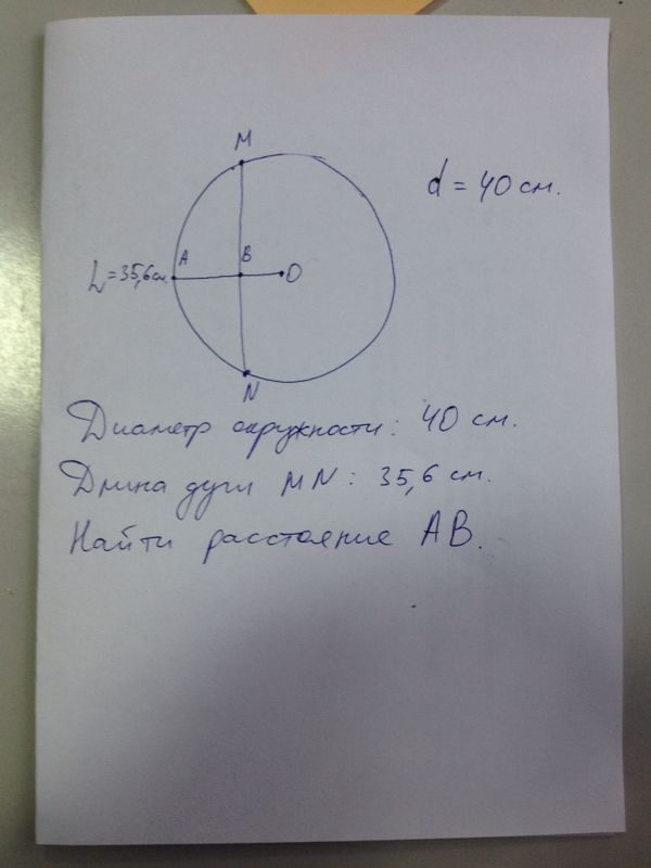 Дана окружность диаметром 40 см с центром в точке O; Прямая MN длиной 35,6 см пересекает диаметр окружности в точке B. Найти расстояние от точки А, находящейся на окружности до точки B.