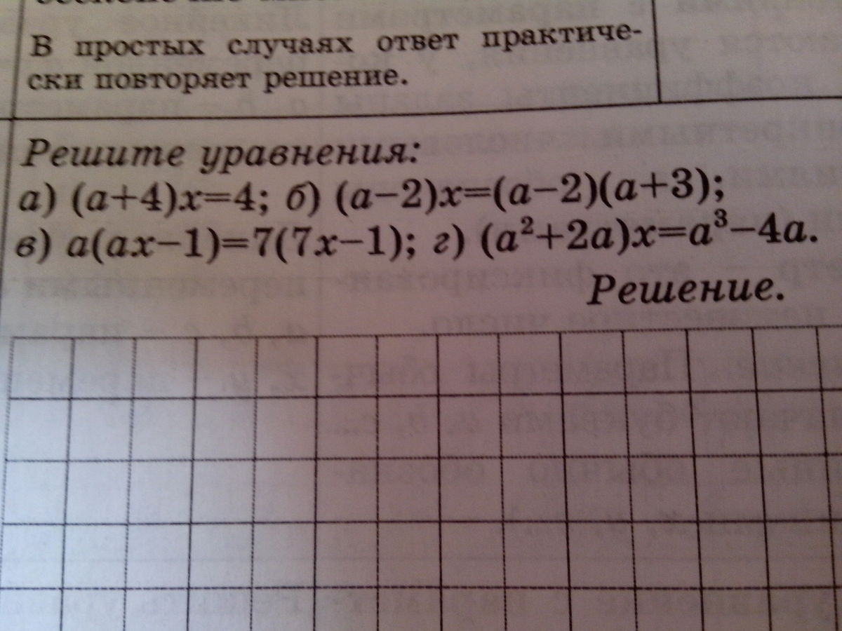 a^2x-a=49x - 7, a^2 x-49 x= a-7; x(a^2-49) =a-7, x(a-7)(a+7)=a-7, x= 1 / (a+7) при a≠ 7 и a ≠ - 7