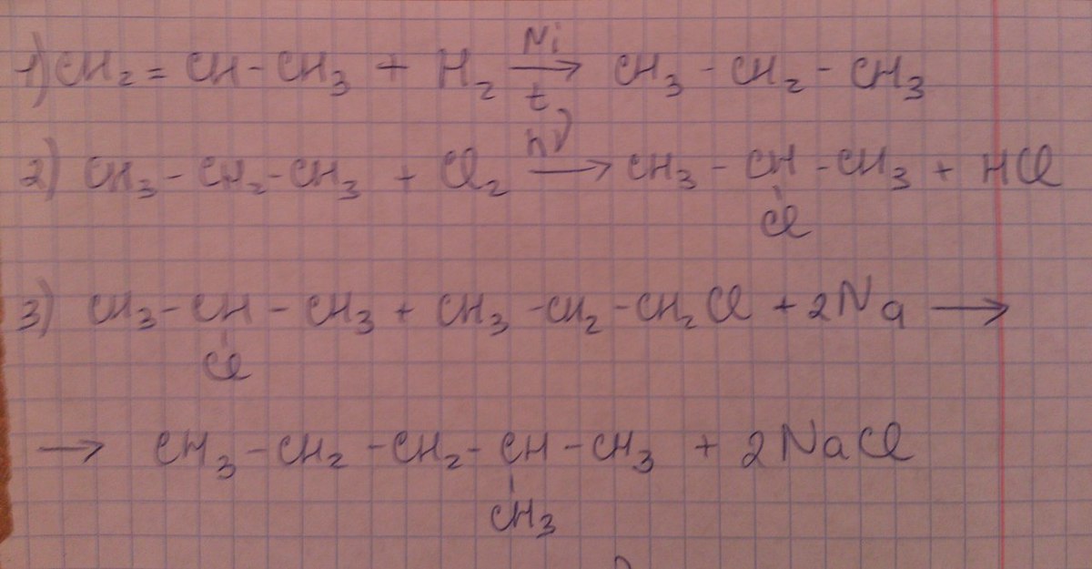 1) CH2=CH-CH3 + H2=>CH3-CH2-CH3 ( t, кат.Ni)