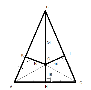 Дан треугольник АВС: АВ=ВС. O- центр вписанной окружности ВО=34 см, ОН=16 см.