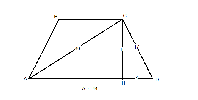 Дана трапеция АВСD. Опустим высоту из вершины С на основание АD. Пусть это будет точка Н. Примем отрезок НD за х, а высоту трапеции Н за h. Из прямоугольных треугольников СНD и САН имеем: х²=17²-h². 39²=h²+(44-х)². Решая эти два уравнения (подставляя первое во второе) имеем:39²=h²+44²-88х+17²-h², откуда х=8. Тогда h=15.
