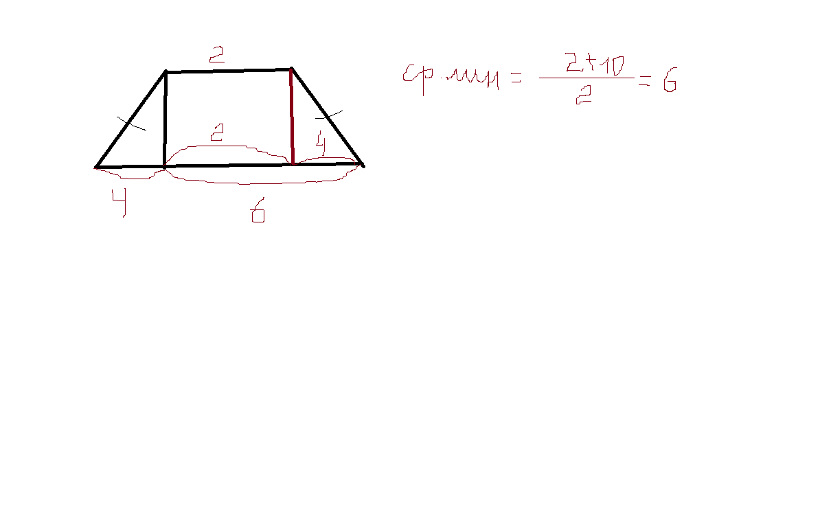 Висота проведена з вершини тупого кута рівнобічної трапеції,ділить її основу на відрізки 4 і 6 см.Знайдіть середню лінію