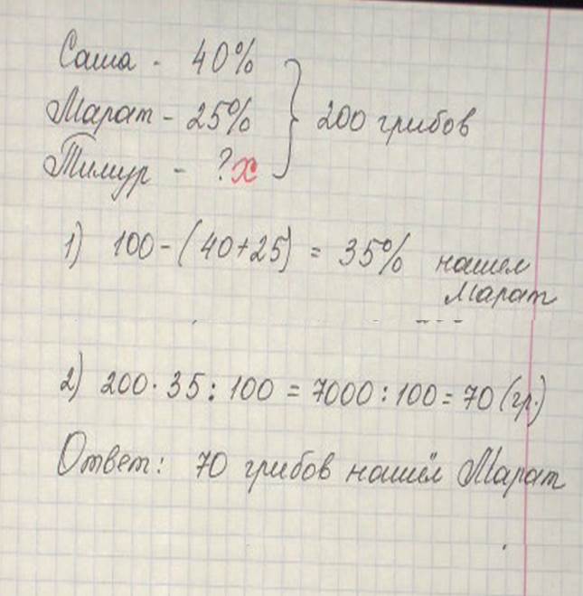 Нашли 200 грибов три мальчик в лесу. Саша нашел 40% всех грибов, а Марат нашел 25% грибов, а Тимур нашел и оставалось. Найдите число грибов, которые нашло Тимур.