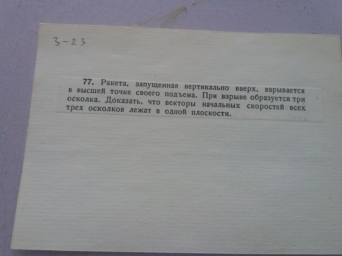 Общий импульс частей ракеты до взрыва в высшей точке подъема и сразу после него остается постоянным и равным нулю. Векторы импульсов осколков могут в сумме дать нуль только тогда, когда они лежат в одной плоскости.
