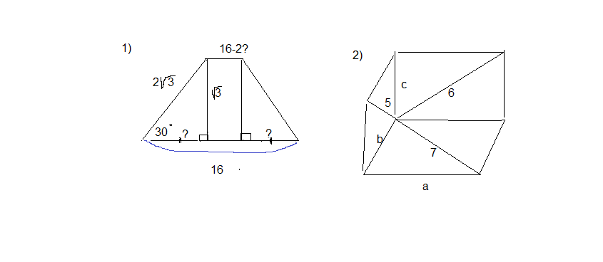Здравствуйте! Помогите пожалуйста решить задание. 1. В равнобокой трапеции большее основание равно 16 см., боковая сторона 2 корень квадратный из 3 см., угол при основании 30 градусов. Меньше основание трапеции равно?