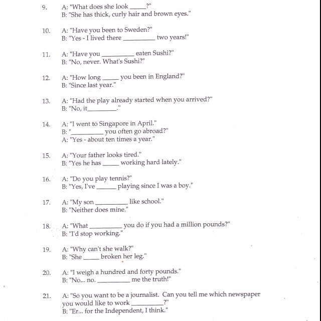 10. A: "Have you been to Sweden?" B: "Yes -1 lived there for two years!"