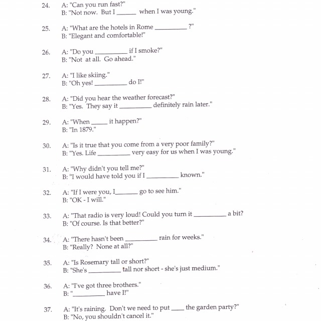 33. A: "That radio is very loud! Could you turn it down a bit? B: "Of course. Is that better?" 34. A: "There hasn't been any rain for weeks." B: "Really? None at all?"