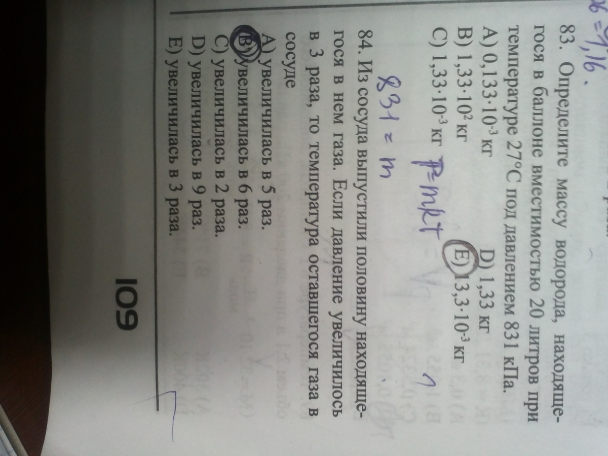 m=P*V*M/R*T=831*10^3*20*10^-3*2*10^-3/8,31*300=13,3*10^-3 кг