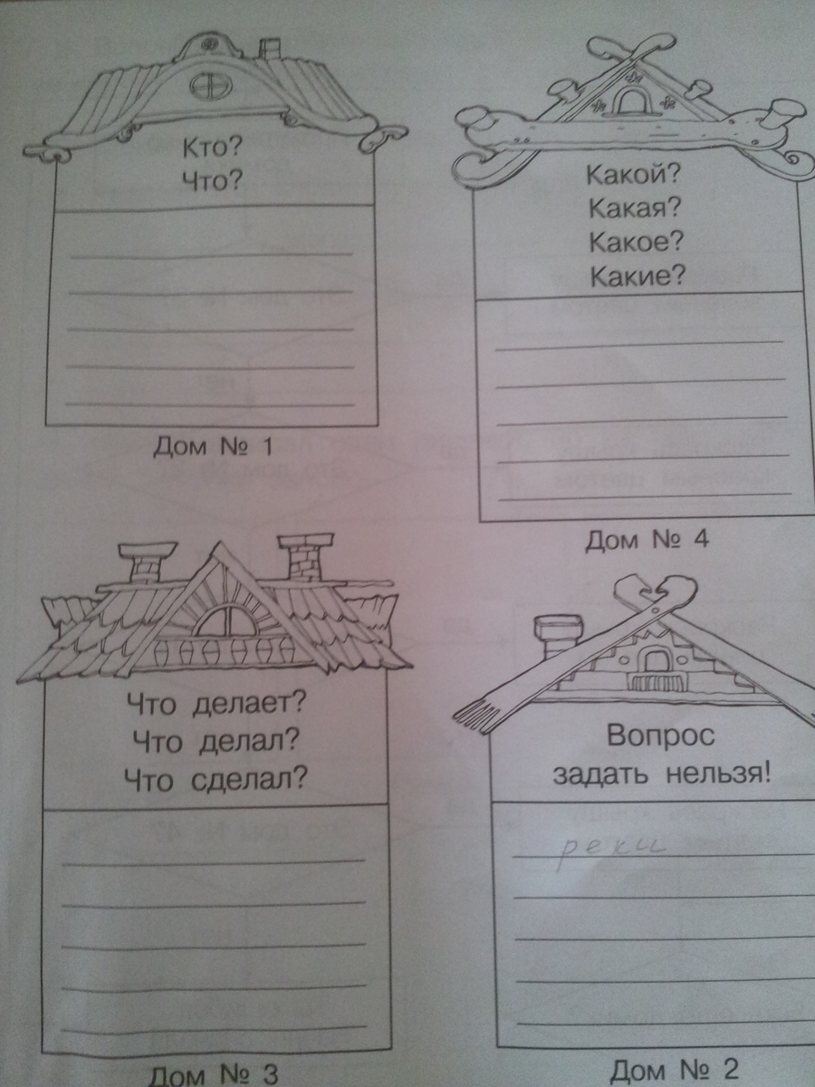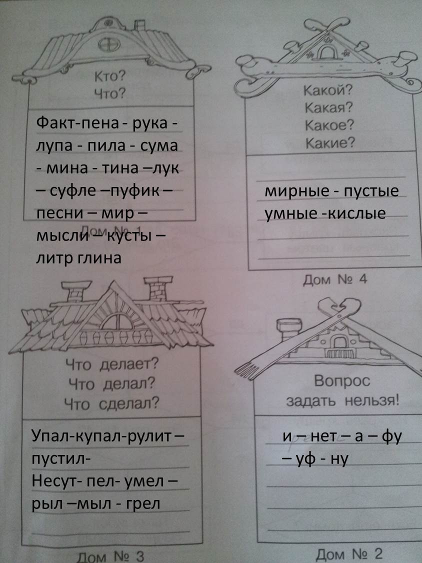 Все слова из этой телеграммы отправились в гости к своим родственникам. Чтобы войти в домики, словам надо ответить на вопросы, записанные в домиках.Помоги словам попасть в нужный дом.
