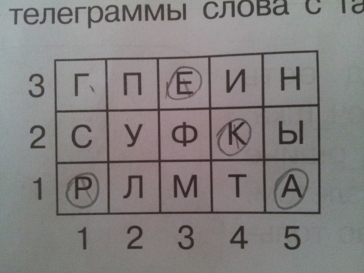 Расшифруйте слово по "адресам" его букв и выпиши из телеграммы слово с таким же корнем (1,1); (3,3); (4,2); (5,1)