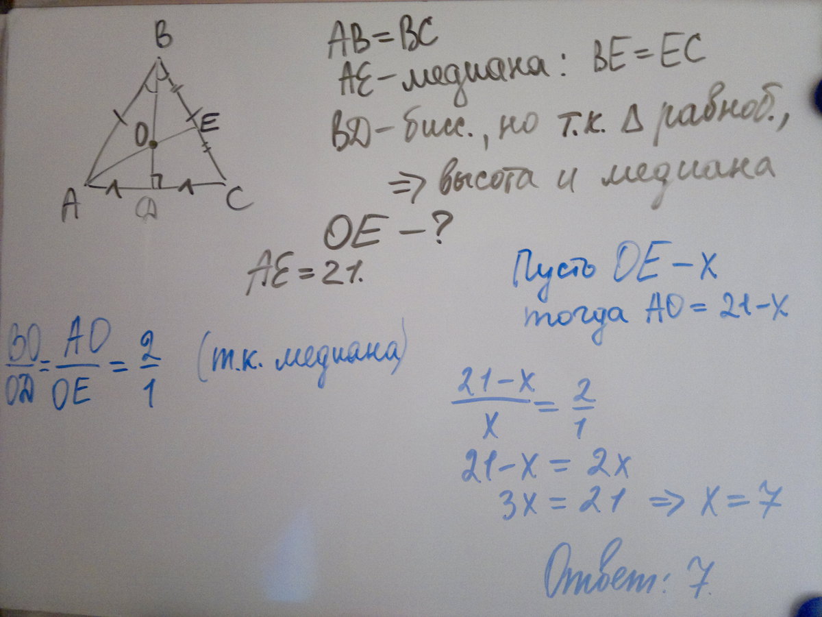 Очень срочно. В треугольнике авс ав=вс и медиана ае пересекается с биссектрисой вд в точке о. Найдите ое если ае=21см