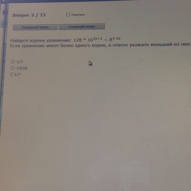 128*16^{2x+1}=8^{3-2x} \ 2^7*(2^4)^{2x+1}=(2^3)^{3-2x} \ 2^{7+8x+4}=2^{9-6x} \ 8+11=9-6x \ 14x=-2 \ x=-  frac{1}{7}