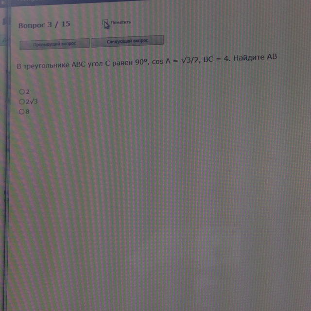 По значению косинуса находим угол, угол равен 30 градусам. Далее есть простое эмпирическое правило "против угла в 30 градусов лежит катет, равный половине гипотенузы", т.е. ответ 8.