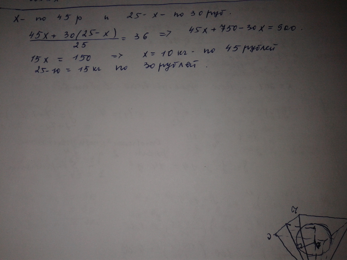 Купили 25 кг бананов двух сортов по цене 45 р. и 30 р. за килограмм. Средняя цена купленных бананов составила 36 р. за килограмм. Сколько килограммов бананов каждого сорта купили?