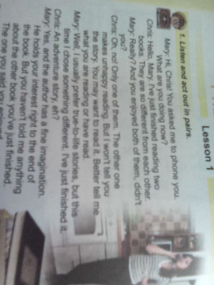 Крис: О, нет! Только одна из них. Одна книга делает чтение невеселым (грустным). Но я не хочу рассказывать тебе историю. Ты можешь прочитать ее. Лучше расскажи мне что ты читаешь сейчас иди что у тебя есть почитать.