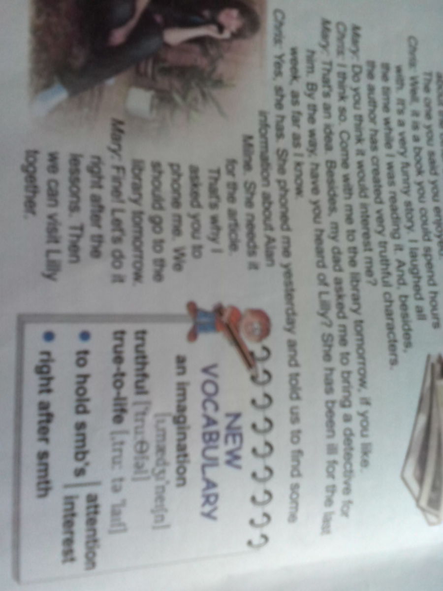 Мэри: Это идея. Кроме того, мой папа просил меня взять детектив для него. Кстати, ты слышал о Лили? Она была больна всю прошлую неделю, насколько я знаю.