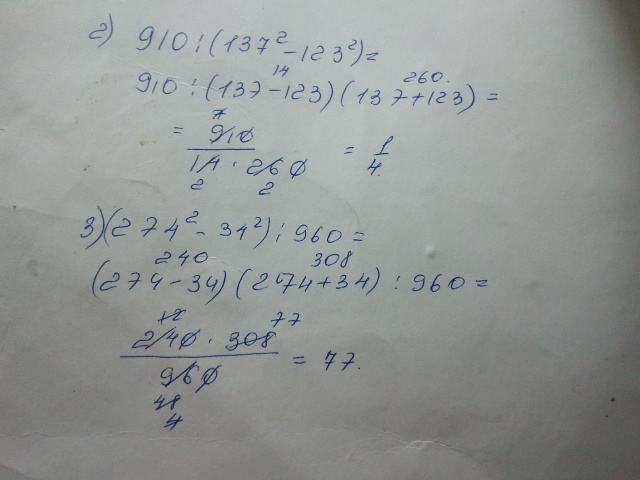 910: (137^2-123^2) = 910 / ((137 - 123)*(137+123)) =