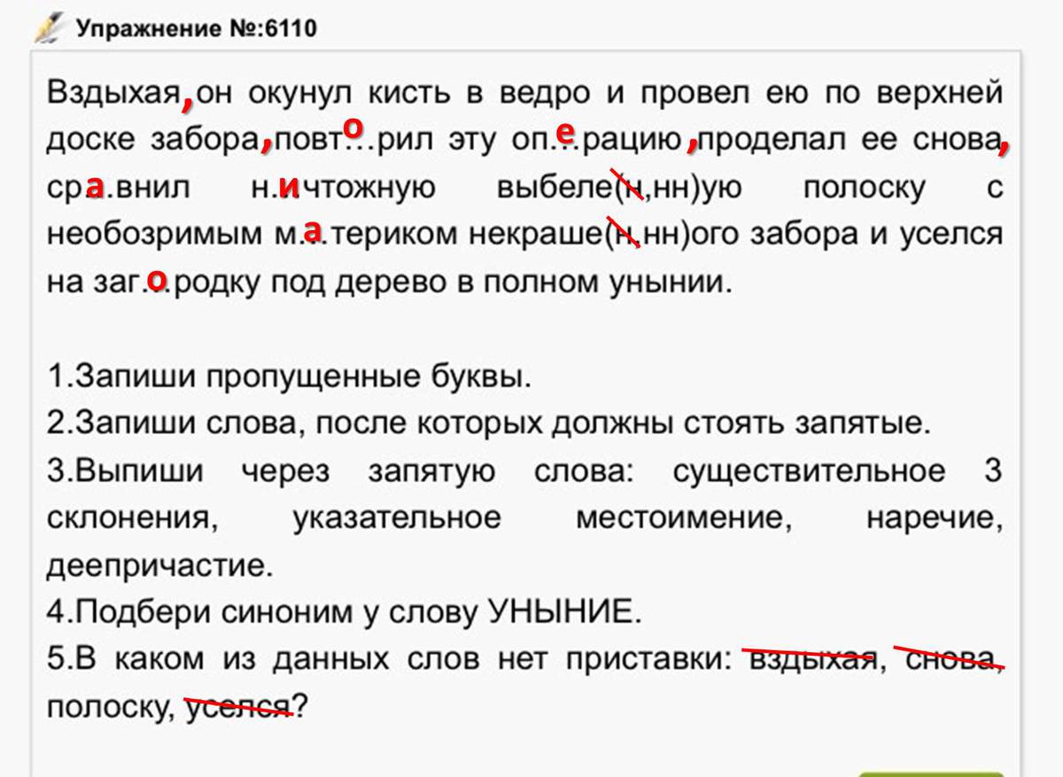 Вздыхая (дееприч.), он(личн. мест) окунул кисть в ведро и провел ею (личн. мест.)по верхней стороне забора, повторил эту )указ. мест.)операцию, проделал ее(лич. мест.) снова(нареч.), сравнил ничтожную выбеленную полоску с необозримым материком некрашеного забора и уселся на загородку под дерево в полном унынии.