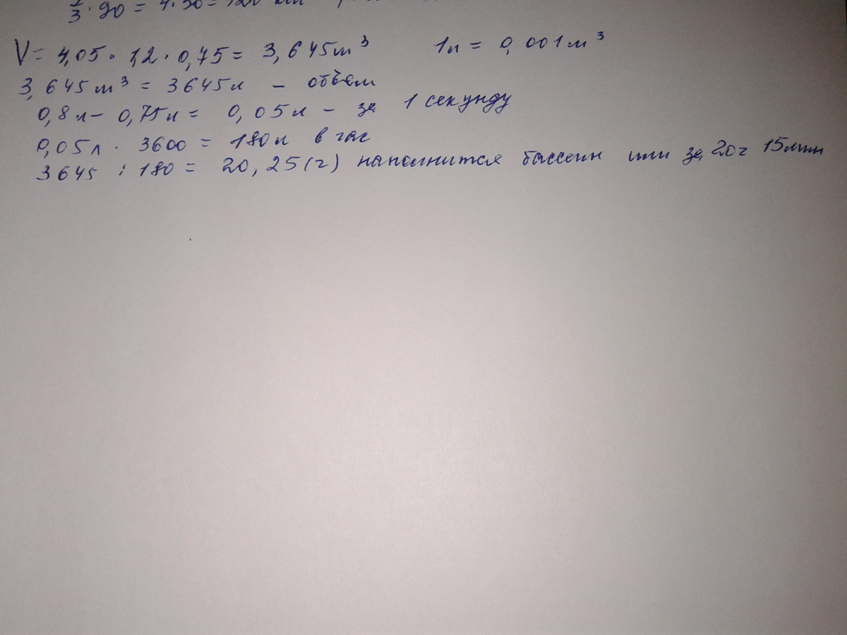 Бассейн,що має форму прямокутного паралелепіпеда, наповнюється трубою,через яку вливається 0,8л води щосекунди, і спорожнюється трубою,через яку виливається 0,75л щосекунди. Довжина басейну 4,05м, ширина 120см,глибина 75см.За скільки годин наповниться басейн,якщо відкрити обидві труби?