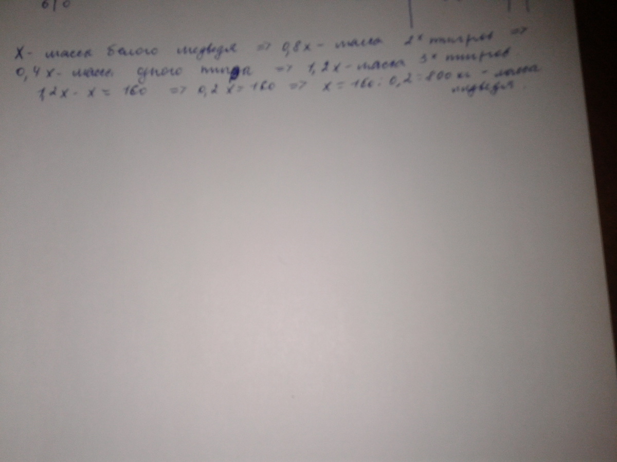 пусть масса Белого медведя х, тогда масса 2 тигров 0,8х, а масса 3: 1,2х