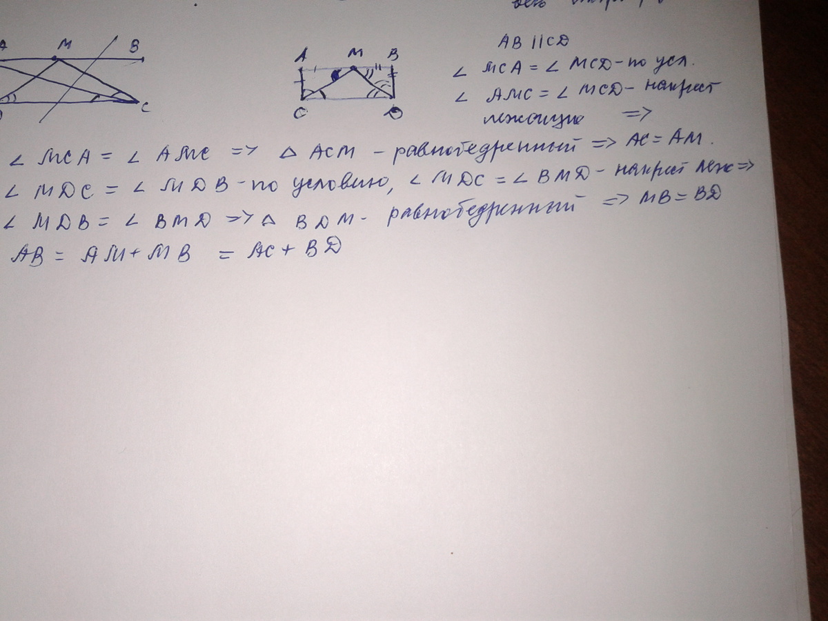 На одной стороне неразвернутого угла взяты точки A и C, на другой B и D, так что AB параллельна CD. Точка M принадлежит отрезку AB; угол MCA = углу MCD, угол MDC = углу MDB. Докажите, что AB = AC + BD.