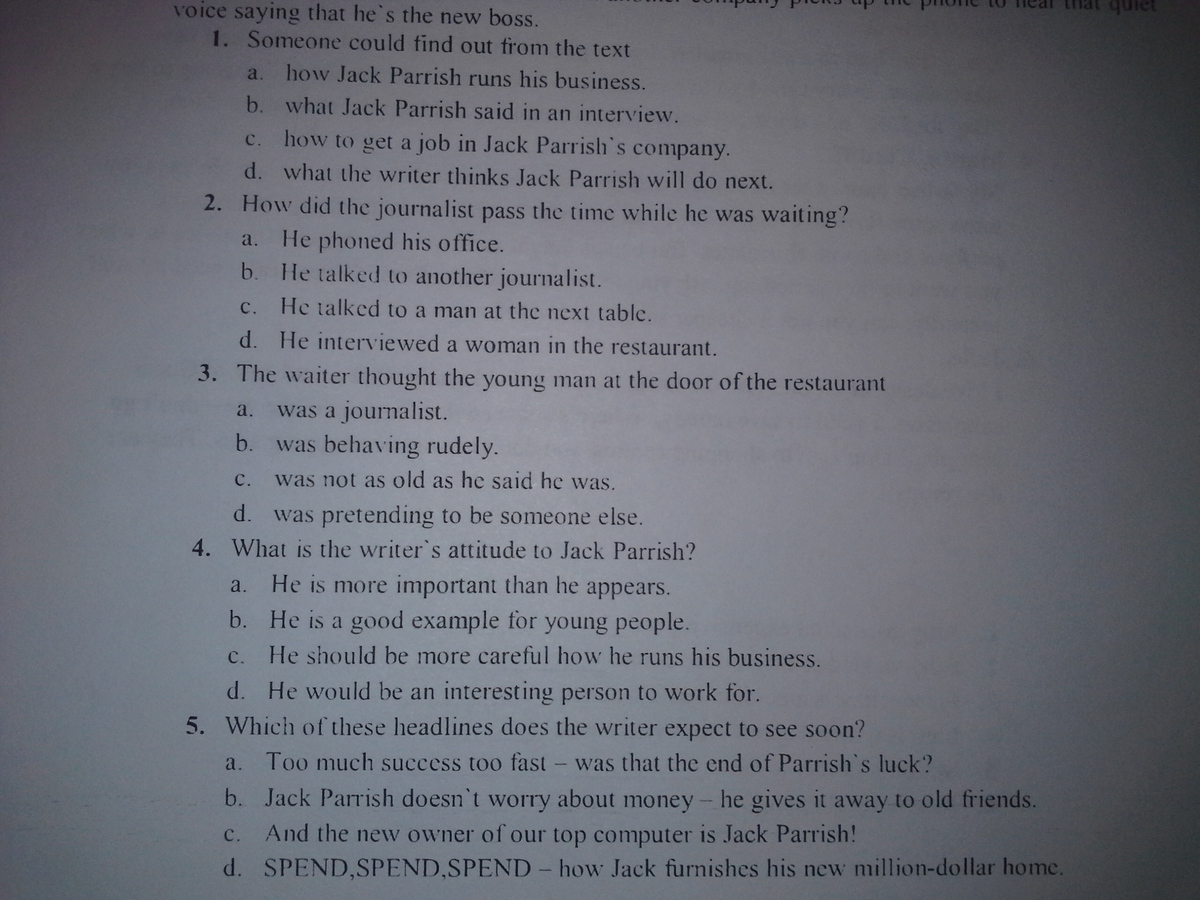 Это рассказ об известном журналисте, который пошел взять интервью у Джека Пэрриш в крутом Нью-йоркском ресторане. Журналист опоздал, но, к счастью, когда он пришел, он обнаружил, что известного человека там еще не было.По дороге к столику, журналист заметил коллегу из его газеты и остановился поболтать с ней. Через пятнадцать минут к нему подошел официант. "Там какой-то молодой человек у входа, говорит, что он обедает с Вами. Я думаю, он шутит, потому что он говорит, что его зовут Джек Пэрриш!"