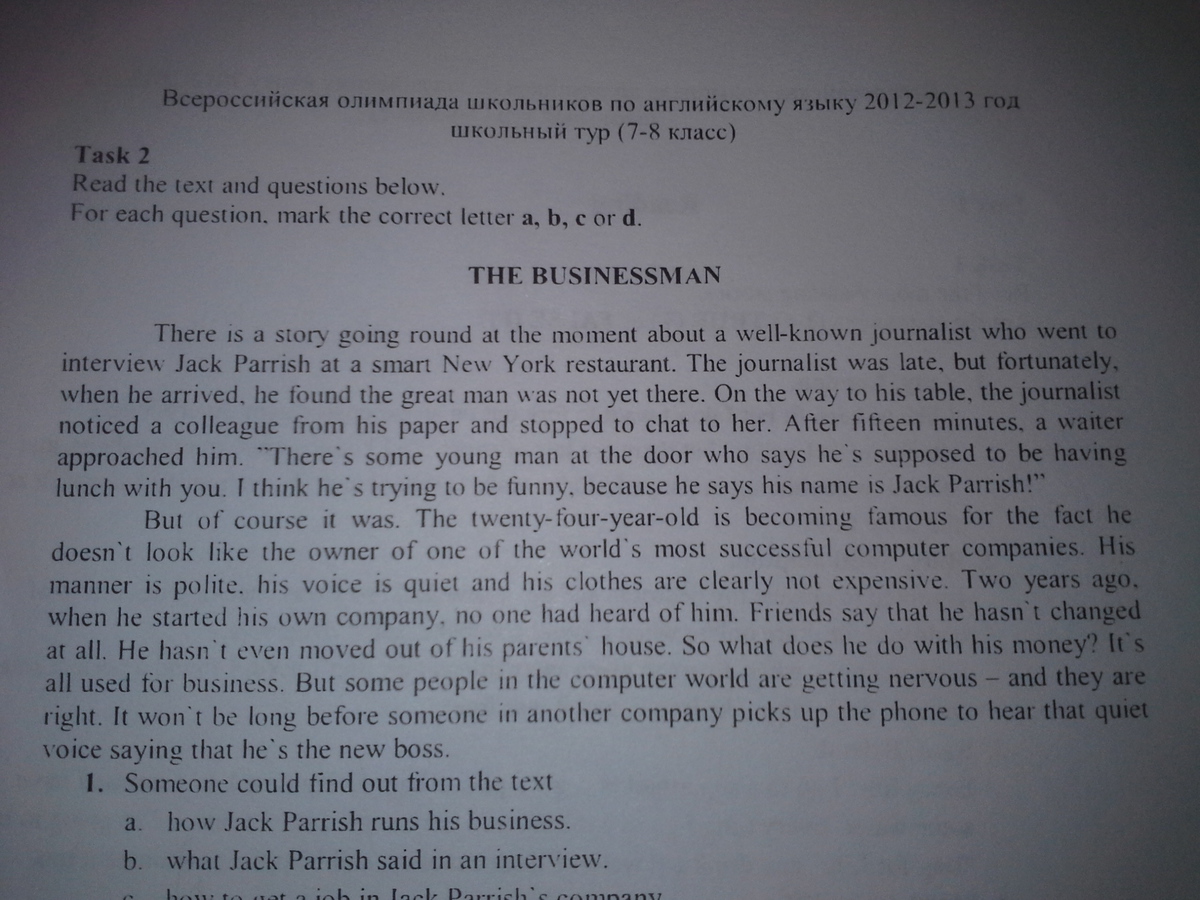Но, конечно, это был он. Двадцати четырехлетний молодой человек был знаменит тем, что не был похож на владельца одной из самых успешных в мире компьютерных компаний. Он был очень вежлив, говорил тихо, и его одежда была реально недорогая. Два года назад, когда он основал свою собственную компанию, никто не слышал о нем. Друзья говорят, что с тех пор он совершенно не изменился. Он даже не уехал из дома своих родителей. Так что же он делает со своими деньгами? Все деньги он вкладывает в бизнес. Но некоторые люди в компьютерном мире начинают нервничать - и они правы. Не пройдет и года, когда в какой-нибудь другой компании снимут трубку и услышат спокойный голос, который скажет, что он их новый босс!