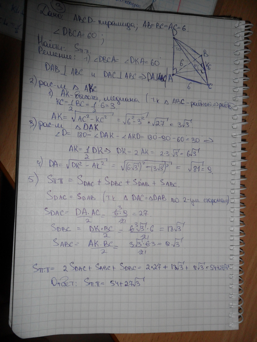 3.) Основанием пирамиды служит правильный треугольник со стороной 6 см; две боковые грани пирамиды перпендикулярны плоскостью основания; угол, образованной третьей гранью с основанием пирамиды, равен 60 градусам. Найдите площадь полной поверхности пирамиды.