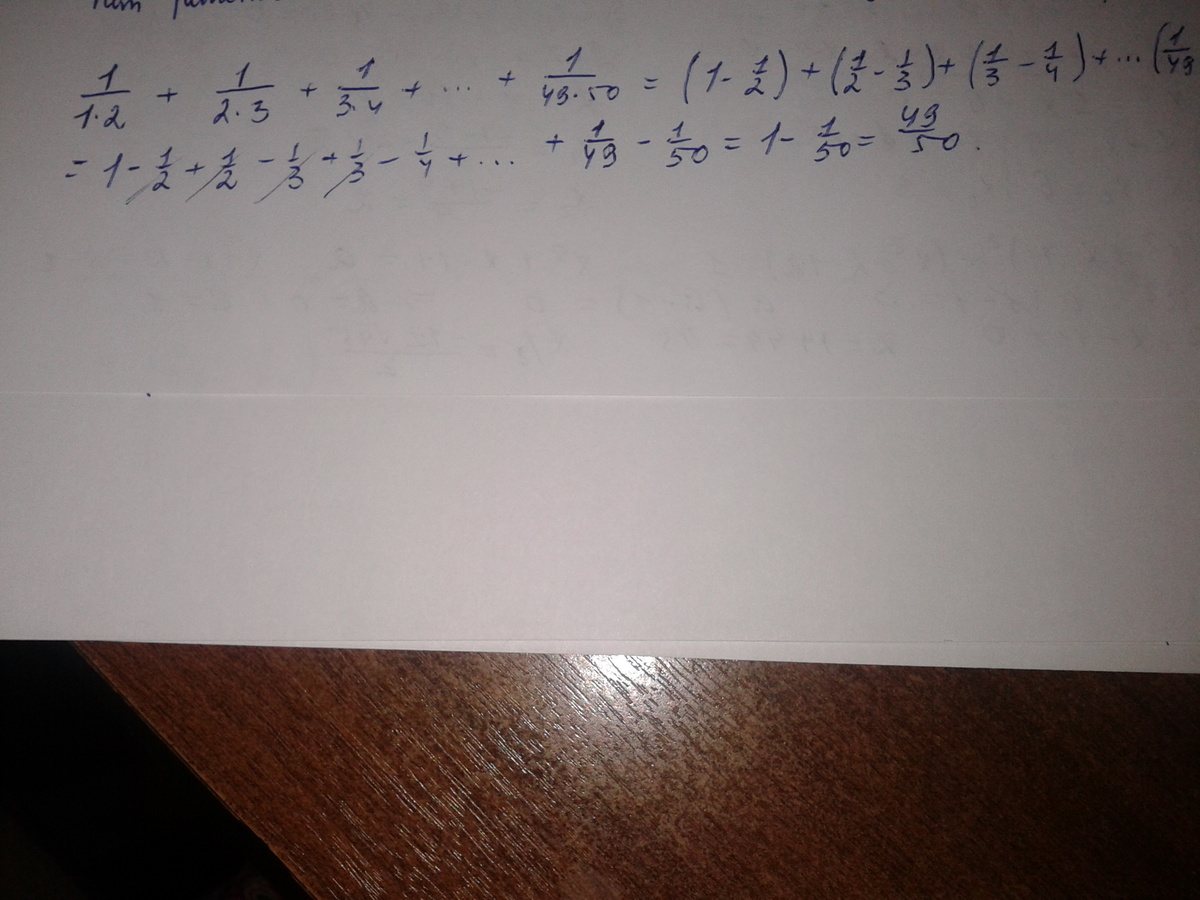 Тема дроби и действие над дробями. Используя наиболее удобный способ вычислений, найти значение выражения: 1/1*2+1/2*3+1/3*4+...+1/49*50=? C объяснением.