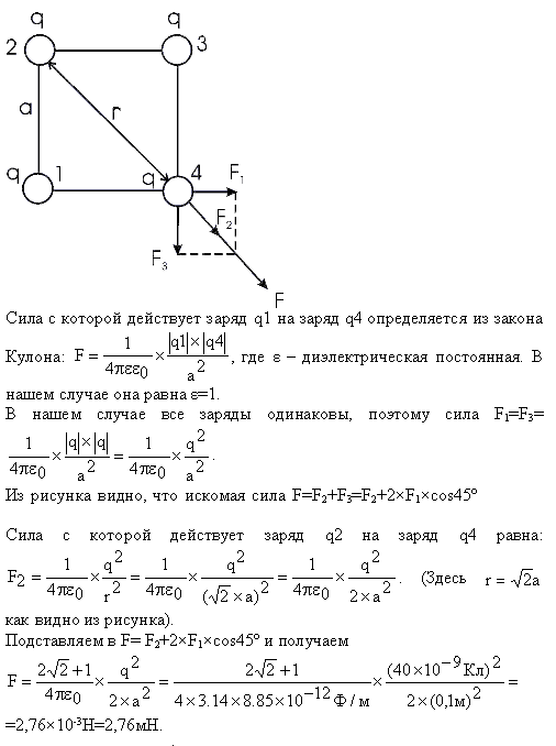 Четыре одинаковых заряда Q1=Q2=Q3=Q4=40 нКл закреплены в вершинах квадрата со стороной а =10 см. Найти силу F, действующую на один из этих зарядов со стороны трех других