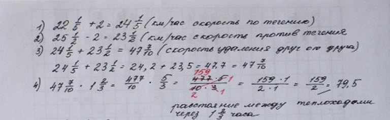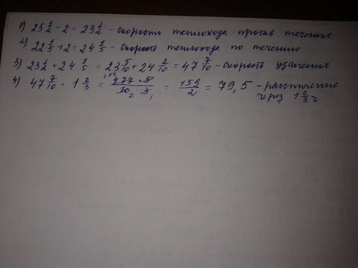 С пристани одновременно вышли два теплохода в противоположных направлениях.Собственная скорость теплохода,плывущего против течения реки 25целых 1/2.Собственная скость теплохода по течению реки 22целые 1/5.Скорость течения реки 2.За какое расстаяние между теплоходами будет через 1целую 2/3ч